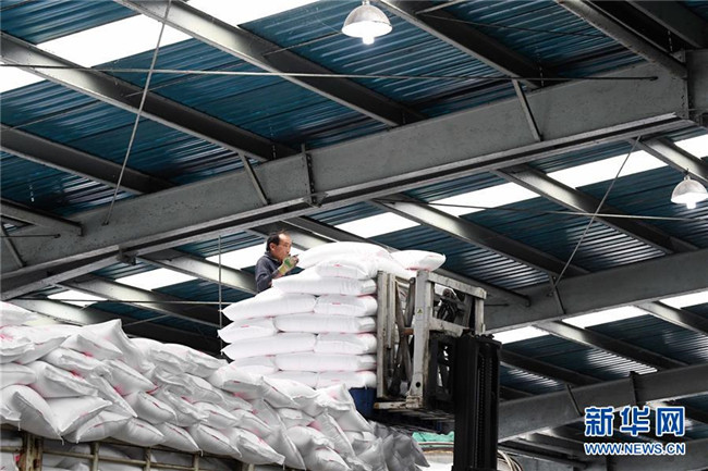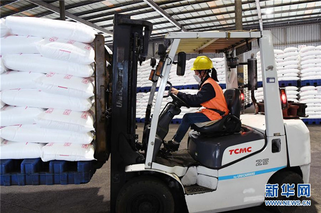10月14日,轉(zhuǎn)移就業(yè)的農(nóng)民在云南省曲靖市沾益區(qū)花山街道勞務(wù)中心尿素包裝裝卸車間工作。