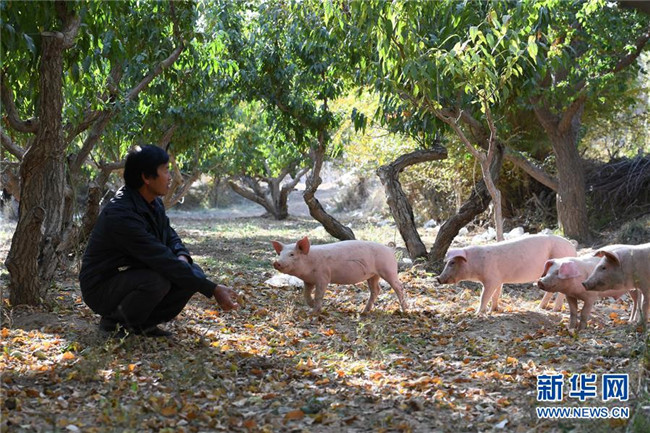 10月24日,在敦煌市郭家堡鎮(zhèn)梁家堡村,村民龔建軍在自家果園中照看豬群。新華社記者 馬寧 攝