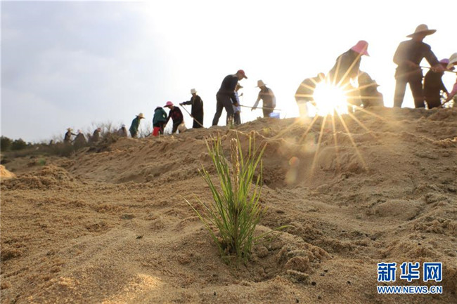江西廬山市蓼南鄉(xiāng)組織村民在長江流域鄱陽湖畔的沙洲上種植瞿麥。瞿麥?zhǔn)且晃吨兴幉?,不僅有固沙綠化作用,還具有較高的經(jīng)濟(jì)價(jià)值(4月12日攝)。新華社發(fā)(韓俊烜 攝)