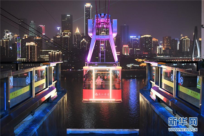 12月23日,“長(zhǎng)江索道”在重慶夜空中運(yùn)行。新華社記者 唐奕 攝