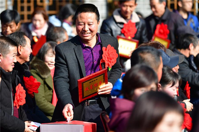 1月7日,稻坪村黨支部書記尹守明在分紅大會上領(lǐng)取村集體分紅。新華社記者 陳斌 攝