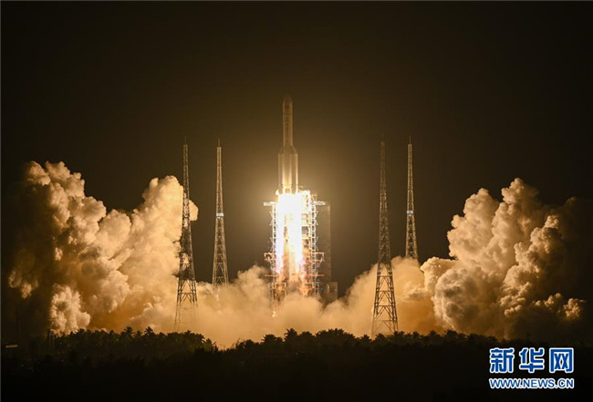 2019年12月27日20時45分,長征五號遙三運載火箭在中國文昌航天發(fā)射場點火升空。 新華社記者陳曄華攝