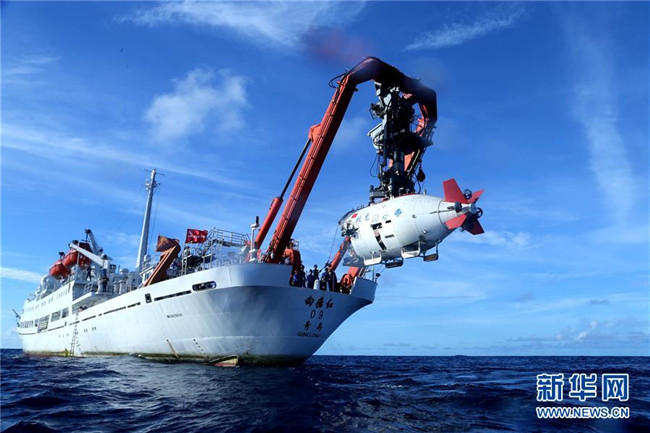 在西太平洋海域,“蛟龍”號載人潛水器離開“向陽紅09”科學(xué)考察船準(zhǔn)備進(jìn)入水中,進(jìn)行中國大洋38航次最后一潛(2017年6月13日攝)。 新華社記者 劉詩平 攝