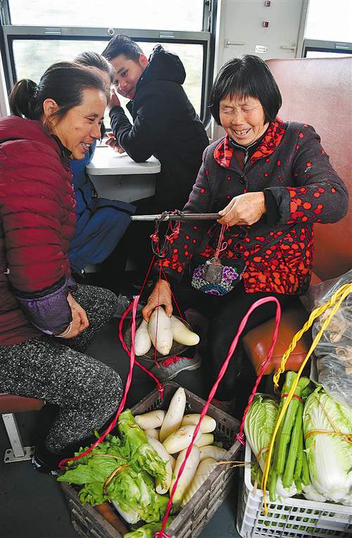 扶貧列車上的列車員常年與沿線各族群眾打交道,與他們建立了深厚的感情。針對(duì)沿線老百姓實(shí)際需求,在保證列車安全的情況下,列車適度開(kāi)放交易“微市場(chǎng)”,允許在公平原則下進(jìn)行農(nóng)副產(chǎn)品市場(chǎng)化交易,車班自購(gòu)電子彈簧秤、一次性塑料袋等,必要時(shí)幫助旅客解決買賣雙方的不時(shí)之需,為列車商品交易提供便利。針對(duì)沿線百姓挑擔(dān)、背筐乘車等情況,列車加強(qiáng)與車站聯(lián)系,對(duì)一些客流量較大、貨物集中的車站,由列車長(zhǎng)提前與車站進(jìn)行聯(lián)系,車班乘務(wù)組提前做好準(zhǔn)備,開(kāi)雙邊門,加強(qiáng)列車疏通,協(xié)助旅客安全乘降,確保安全正點(diǎn)。