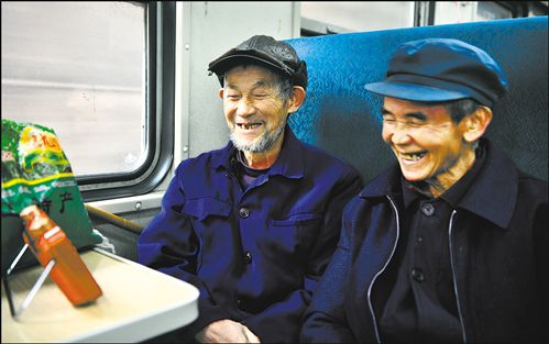 在7270次列車上,湖南省靖州苗族侗族自治縣的汪家(右)與楊永燦,在行駛的列車車廂里開(kāi)心地觀看“小電視”。