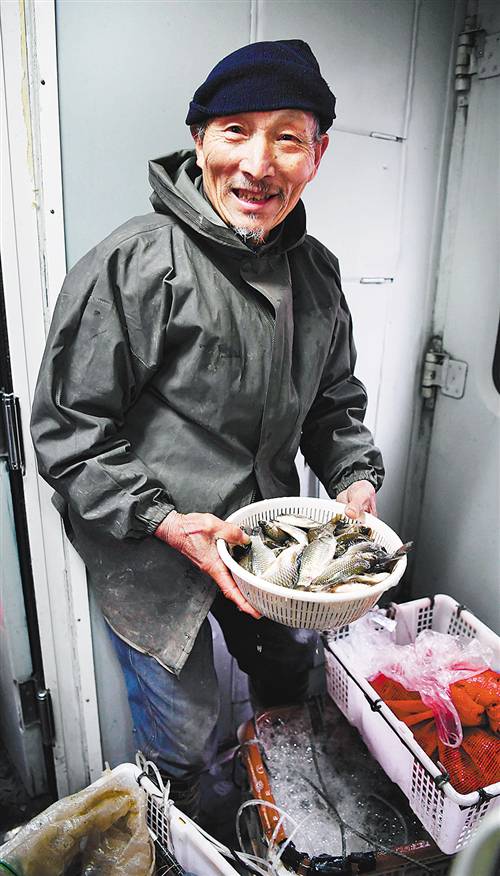 懷化至梅江的7272次列車車廂里,80歲的符長(zhǎng)理老人帶著剛剛捕撈的魚(yú)蝦,乘車前往貴州省銅仁市菜市場(chǎng)銷售。