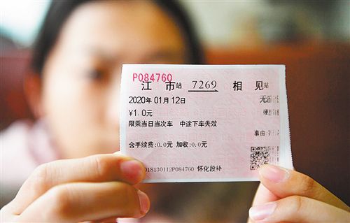 ▲江市站開(kāi)往相見(jiàn)站的7269次列車上,一名旅客展示自己的車票,票價(jià)只有1元。列車最高票價(jià)11元。