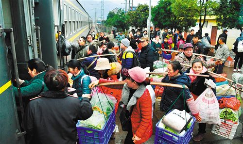 ▲??吭诤鲜÷殛?yáng)郭公坪站的7272次列車,當(dāng)?shù)毓r(nóng)菜農(nóng)挑著擔(dān)子準(zhǔn)備上車。這趟“慢火車”所經(jīng)過(guò)的地區(qū)多為“老少邊窮”,經(jīng)濟(jì)欠發(fā)達(dá)。為盤活沿途百姓致富渠道,鐵路部門開(kāi)“綠燈”允許乘客攜帶大量鮮活貨物乘車。