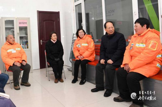 每逢節(jié)慶假日,往往是環(huán)衛(wèi)工人最忙最累的時候。石泰峰、布小林惦記著這些非常辛苦的勞動者,來到賽罕區(qū)環(huán)衛(wèi)局管理八所,向他們祝賀新年。在環(huán)衛(wèi)工人休息室,石泰峰、布小林與大家圍坐在一起親切交談,了解春節(jié)期間值班安排情況,仔細察看休息室及相關(guān)保障情況。石泰峰深情地說,環(huán)衛(wèi)工人是城市的“美容師”,你們一人勞累,換來萬人清潔,沒有你們的辛勤工作,就沒有城市環(huán)境的清潔美麗,也就沒有市民生活的安逸舒適,謝謝你們,給你們拜年了。