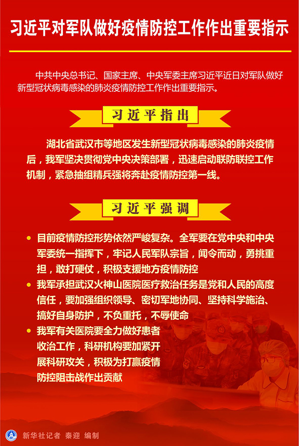 中共中央總書(shū)記、國(guó)家主席、中央軍委主席習(xí)近平近日對(duì)軍隊(duì)做好新型冠狀病毒感染的肺炎疫情防控工作作出重要指示。