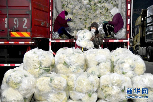 2月1日,在山東省壽光農(nóng)產(chǎn)品物流園,菜農(nóng)搬運蔬菜以保障新冠肺炎疫情防控期間蔬菜供應(yīng)。新華社記者 郭緒雷 攝