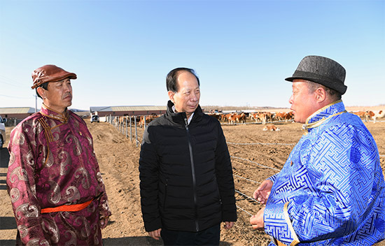 3月23日,自治區(qū)黨委書(shū)記、人大常委會(huì)主任石泰峰來(lái)到赤峰市克什克騰旗達(dá)來(lái)諾日鎮(zhèn)崗更嘎查西門塔爾牛養(yǎng)殖專業(yè)合作社,了解帶動(dòng)已脫貧戶穩(wěn)定長(zhǎng)效增收情況。內(nèi)蒙古日?qǐng)?bào)社融媒體記者 袁永紅 攝