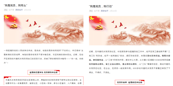 2月20日,經開區(qū)通過微信公眾號、新浪微博策劃制作《我是黨員,我?guī)ь^》《我是黨員,我行動》系列網(wǎng)絡稿件,刊播下沉社區(qū)一線的黨員干部事跡10期,以小見大,充分展現(xiàn)基層黨組織和黨員干部勇當先鋒、敢打先陣的帶頭作用。