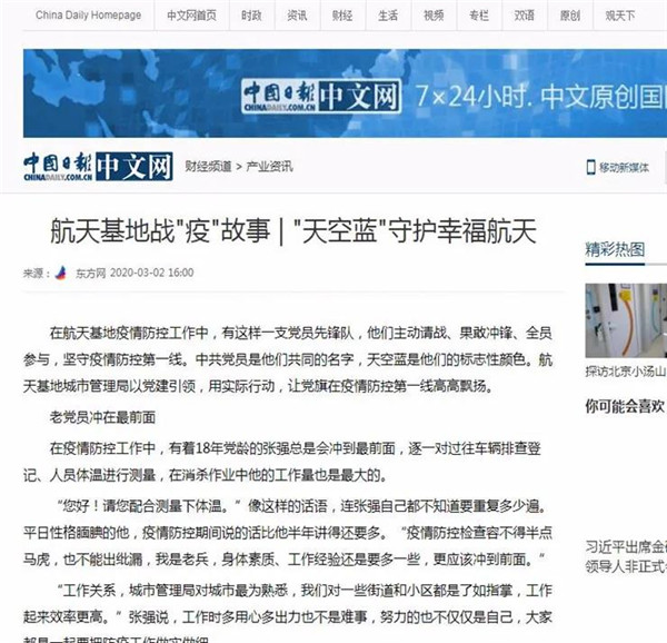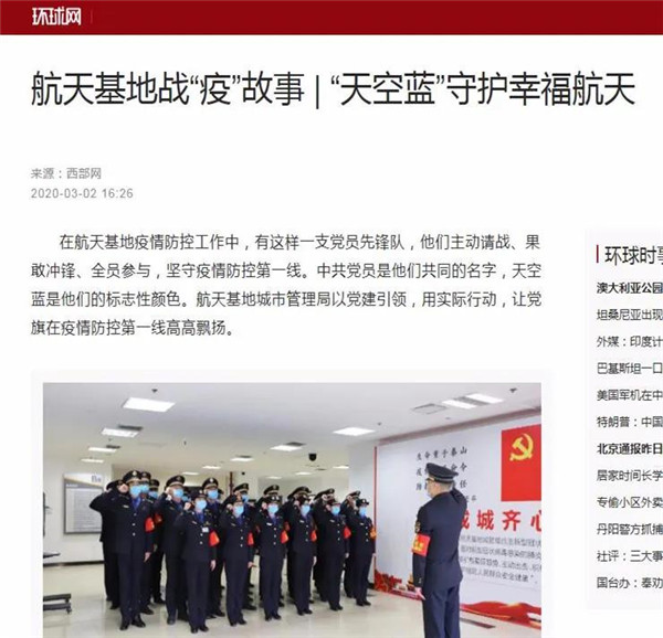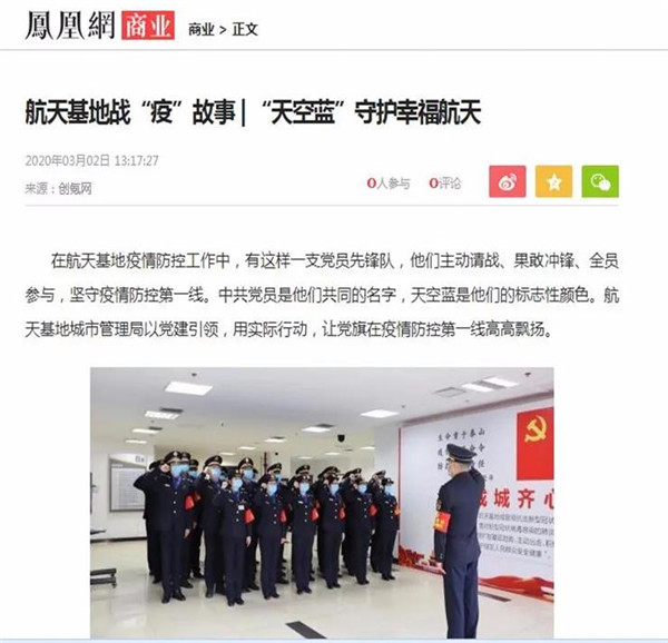 3月2日,航天基地《“天空藍”守護幸福航天》,講述了擁有18年黨齡的張強、退役士官魏斌、工作人緣好李鵬飛用行動展現(xiàn)共產黨人政治本色的積極實踐。國際在線、中國日報網(wǎng)、環(huán)球網(wǎng)、鳳凰網(wǎng)、西部網(wǎng)、三秦網(wǎng)、搜狐等近20家中央、省級、市級網(wǎng)絡媒體轉發(fā),網(wǎng)友產生強烈共鳴。
