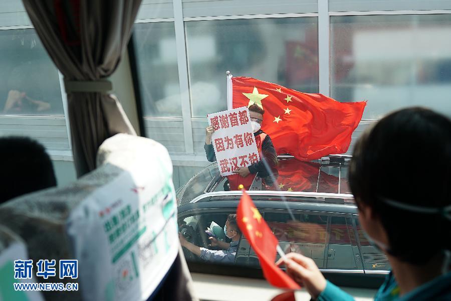 歡送的人群舉著橫幅——“感謝北京,因?yàn)橛心?,武漢不怕”“致敬最美逆行者”等標(biāo)語在陽光下閃動(dòng)。