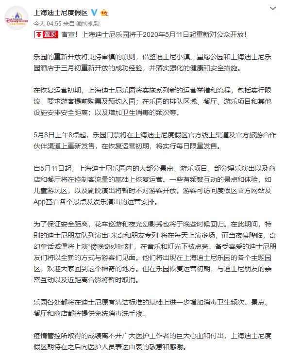 據(jù)上海迪士尼度假區(qū)官方微博消息,上海迪士尼樂園將于2020年5月11日起重新對(duì)公眾開放。在恢復(fù)運(yùn)營(yíng)初期,上海迪士尼樂園將實(shí)施系列新的運(yùn)營(yíng)舉措和流程,包括實(shí)行限流、要求游客提前購(gòu)票及預(yù)約入園,在樂園的排隊(duì)區(qū)域、餐廳、游樂項(xiàng)目和其他設(shè)施安排安全距離,以及增加衛(wèi)生消毒的頻次等。