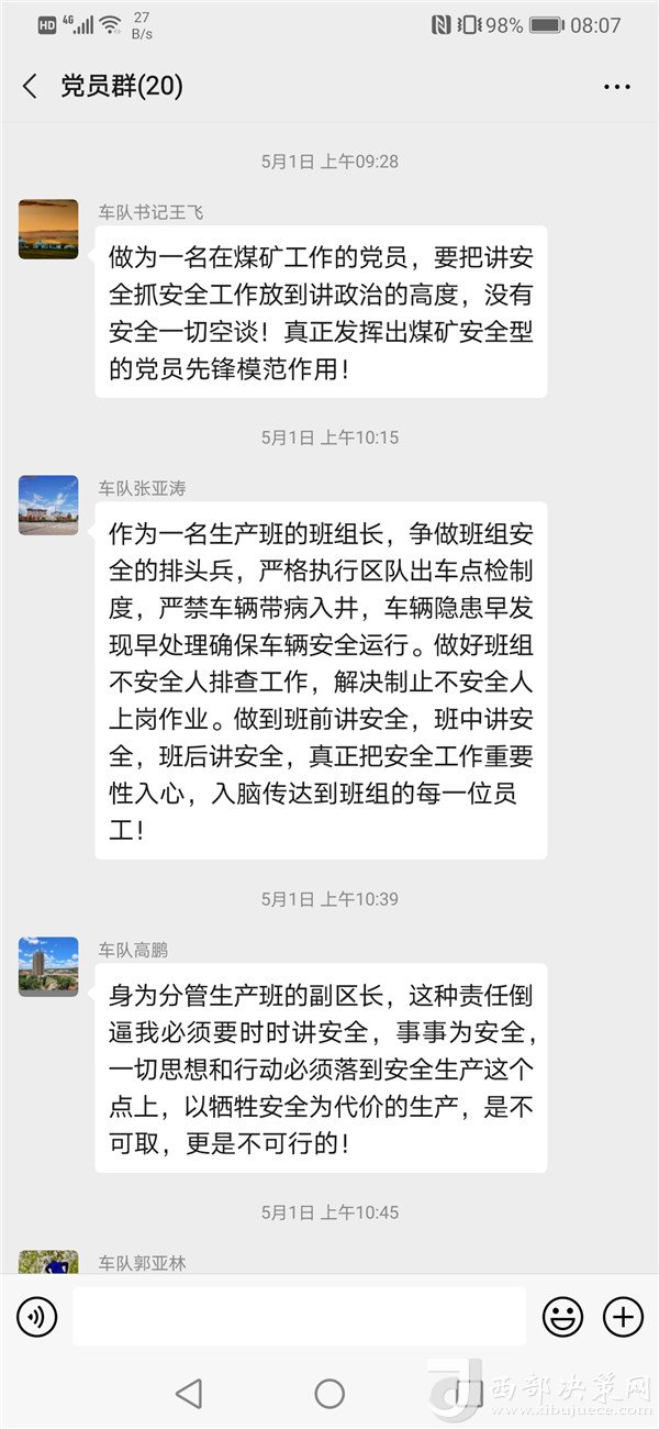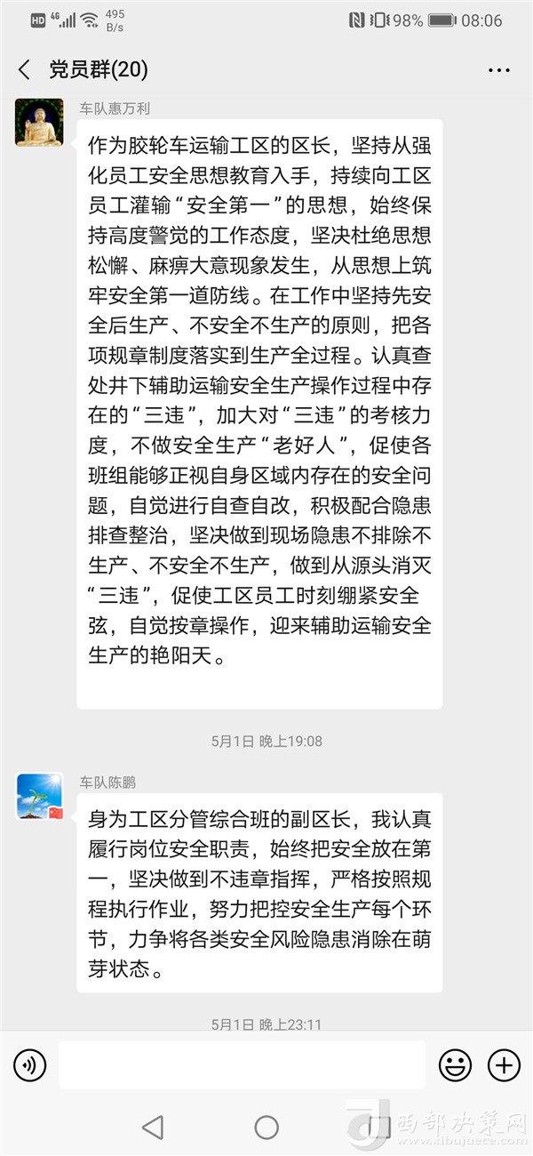 西部決策網(wǎng)訊(記者王瑞鵬 通訊員 張亞濤)為更好地發(fā)揮基層黨支部戰(zhàn)斗堡壘作用、廣大黨員先鋒模范作用,5月份,陜北礦業(yè)檸條塔公司膠輪車運輸工區(qū)開展“講安全、抓安全”主題黨日活動。該支部按照“全員學(xué)習(xí)、座談討論、結(jié)合崗位實際”的學(xué)習(xí)方式,全面深入開展“吸取教訓(xùn)、查擺問題、整改落實、確保安全”主題黨日活動。
