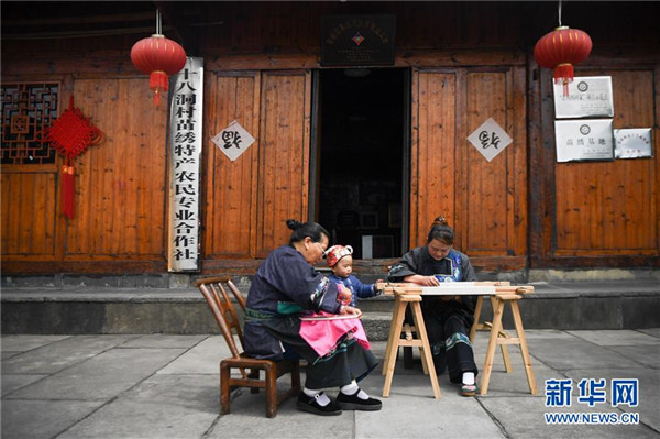 吳美金(右一)在十八洞村苗繡特產(chǎn)農(nóng)民專(zhuān)業(yè)合作社繡苗繡(4月24日攝)。1967年出生的吳美金,1992年嫁入飛蟲(chóng)村(現(xiàn)十八洞村飛蟲(chóng)寨)時(shí),只有爛泥路的飛蟲(chóng)村不僅田土少,掙錢(qián)活路也少,生活十分困難。2014年,吳美金加入了十八洞村苗繡特產(chǎn)農(nóng)民專(zhuān)業(yè)合作社,從小就會(huì)的苗繡傳統(tǒng)手藝如今成了家庭增收的法寶,不僅在家門(mén)口就把錢(qián)掙了,同時(shí)還能照顧年幼的孫子孫女。“現(xiàn)在的日子,比年輕的時(shí)候好多了。”吳美金說(shuō)。新華社記者薛宇舸攝