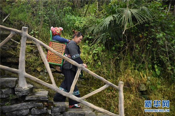 吳美金背著孫子走在十八洞村中,準(zhǔn)備前往村里的苗繡合作社(4月24日攝)。1967年出生的吳美金,1992年嫁入飛蟲(chóng)村(現(xiàn)十八洞村飛蟲(chóng)寨)時(shí),只有爛泥路的飛蟲(chóng)村不僅田土少,掙錢(qián)活路也少,生活十分困難。2014年,吳美金加入了十八洞村苗繡特產(chǎn)農(nóng)民專(zhuān)業(yè)合作社,從小就會(huì)的苗繡傳統(tǒng)手藝如今成了家庭增收的法寶,不僅在家門(mén)口就把錢(qián)掙了,同時(shí)還能照顧年幼的孫子孫女。“現(xiàn)在的日子,比年輕的時(shí)候好多了。”吳美金說(shuō)。新華社記者薛宇舸攝