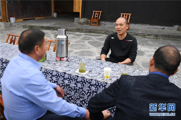 楊正邦(中)在和來(lái)自浙江的住客攀談(4月25日攝)。楊正邦1978年出生于十八洞村,在外打工多年。近些年,眼看來(lái)十八洞村的游客越來(lái)越多,村里越來(lái)越熱鬧,楊正邦在2017年結(jié)束自己的打工生涯回鄉(xiāng)發(fā)展。他先是在村里擺起小吃攤,2018年開(kāi)起農(nóng)家樂(lè),去年又搭起新房子擴(kuò)建成民宿,年度家庭人均純收入從2014年的1923元增加到2019年的7173元。新華社記者薛宇舸攝
