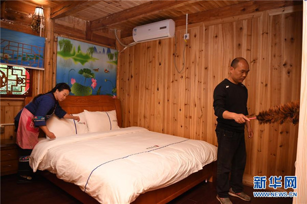 楊正邦(右)和妻子施蘭珍一起打掃民宿房間(4月25日攝)。楊正邦1978年出生于十八洞村,在外打工多年。近些年,眼看來(lái)十八洞村的游客越來(lái)越多,村里越來(lái)越熱鬧,楊正邦在2017年結(jié)束自己的打工生涯回鄉(xiāng)發(fā)展。他先是在村里擺起小吃攤,2018年開(kāi)起農(nóng)家樂(lè),去年又搭起新房子擴(kuò)建成民宿,年度家庭人均純收入從2014年的1923元增加到2019年的7173元。新華社記者薛宇舸攝