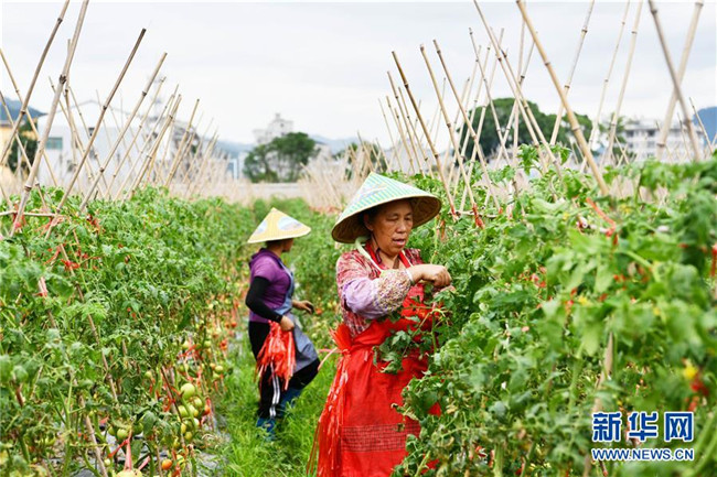 6月2日,農(nóng)民在貴州省榕江縣車江壩區(qū)采收西紅柿。 新華社記者 楊文斌 攝