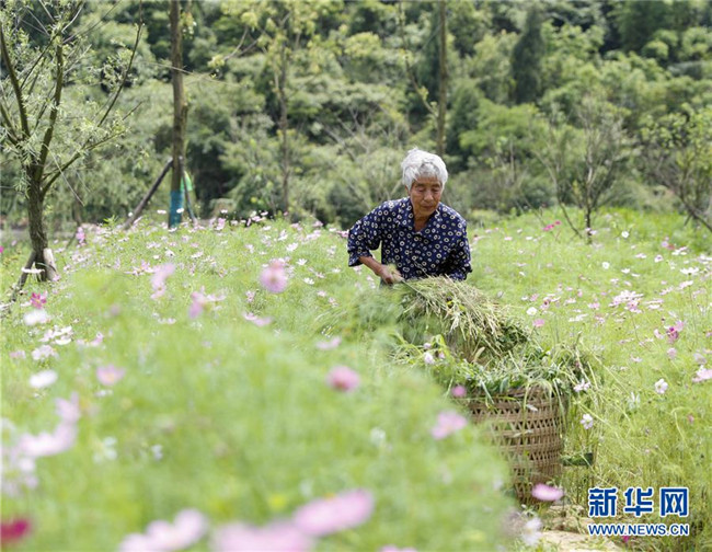 6月10日,在重慶市渝北區(qū)大盛鎮(zhèn)天險(xiǎn)洞村,村民為觀賞花卉除草。新華社記者 黃偉 攝