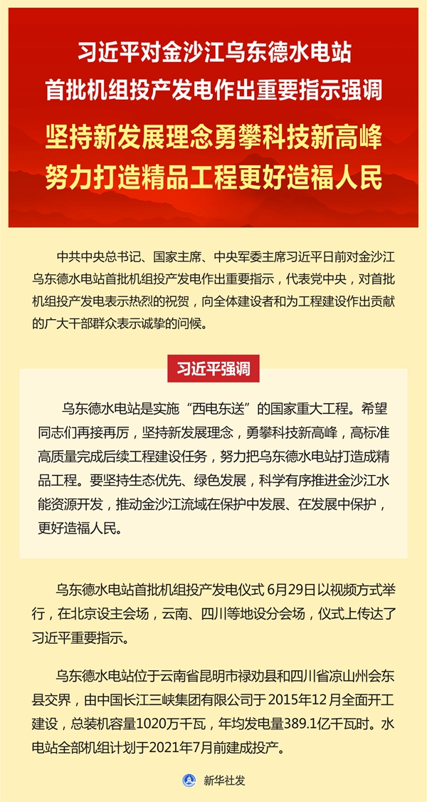 原標題:習近平對金沙江烏東德水電站首批機組投產(chǎn)發(fā)電作出重要指示強調(diào) 堅持新發(fā)展理念勇攀科技新高峰 努力打造精品工程更好造福人民