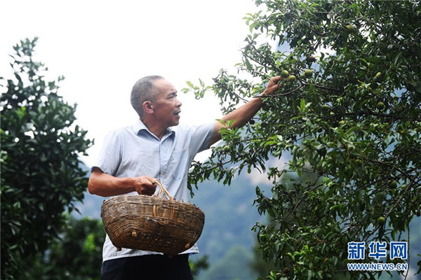 7月3日,下莊村黨支部書記毛相林在采摘脆李。當年他曾帶領村民修出一條“通天路”。新華社記者王全超攝