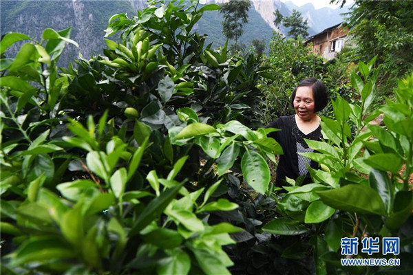 7月3日,63歲的下莊村村民劉崇英在查看柑橘的生長情況。新華社記者王全超攝