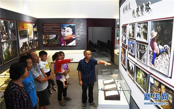 7月3日,下莊村黨支部書記毛相林(右一)在下莊精神陳列館內講述當年修路的故事。新華社記者王全超攝