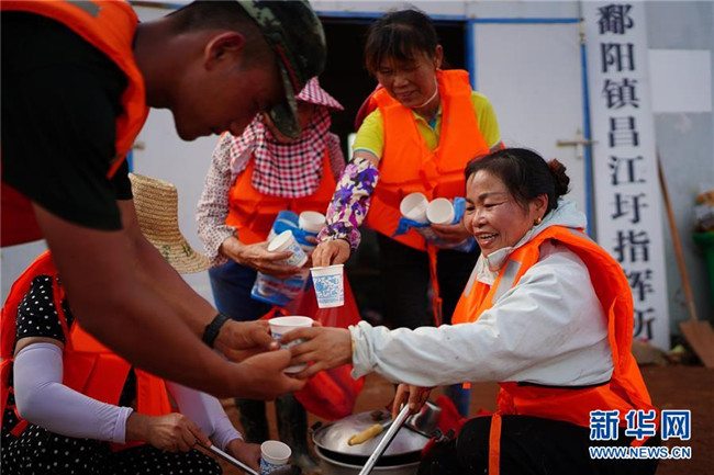 7月11日,在江西省鄱陽縣鄱陽鎮(zhèn)江家?guī)X村,“阿姨團”隊長余風英(右一)給武警戰(zhàn)士盛綠豆湯。 新華社記者 周密 攝