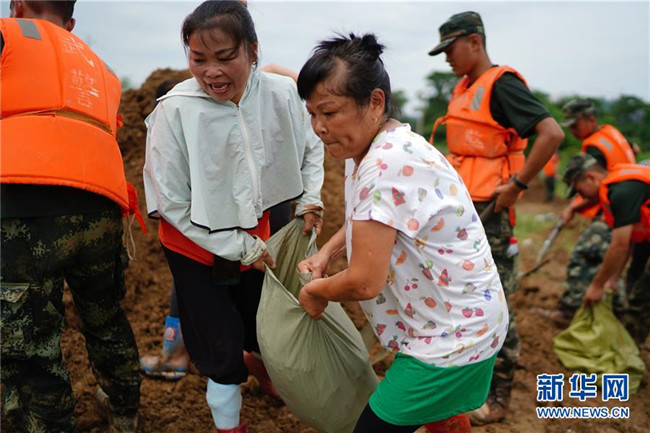 村民余風英是這支“阿姨團”的隊長,“我們之前都是一起跳廣場舞的‘舞友’,洪水來了,看到這么多救援人員來幫我們修圩堤,我們也要盡一份自己的力量。”