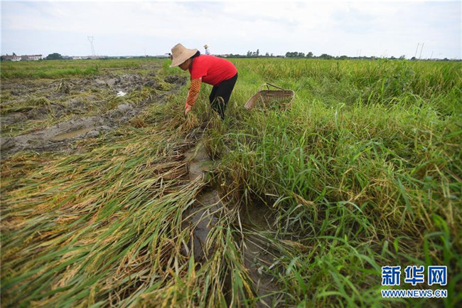 7月11日,村民在湖南省岳陽市岳陽縣筻口鎮(zhèn)一處農(nóng)田里收割倒伏的早稻。 新華社記者 陳澤國 攝