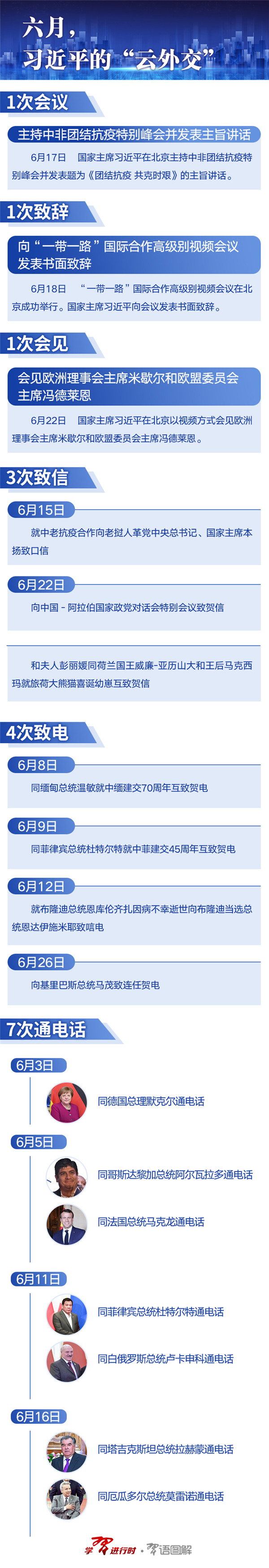 6月,習(xí)近平同德國(guó)總理默克爾、法國(guó)總統(tǒng)馬克龍、哥斯達(dá)黎加總統(tǒng)阿爾瓦拉多等外國(guó)領(lǐng)導(dǎo)人通電話(huà);向中國(guó)-阿拉伯國(guó)家政黨對(duì)話(huà)會(huì)特別會(huì)議致賀信;以視頻方式主持中非團(tuán)結(jié)抗疫特別峰會(huì)、會(huì)見(jiàn)歐洲理事會(huì)主席米歇爾和歐盟委員會(huì)主席馮德萊恩……