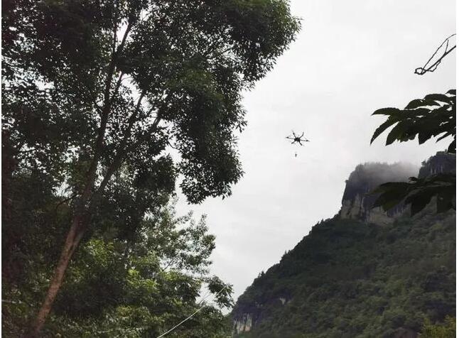 由于光纜恢復(fù)區(qū)域地勢險峻,搶修難度大,搶修人員結(jié)合現(xiàn)場實際情況后決定采用無人機(jī)牽引技術(shù)布放光纜,這樣省時、省力又安全!