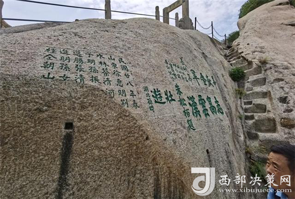 在登山沿途各景點、峭壁石巖上遍布著歷代文人墨客留下的墨寶,內(nèi)容十分豐富、風(fēng)格各異、藝術(shù)價值非常高、教化意義也非常積極。摩崖石刻在無形中成為了蔚為壯觀的石刻藝術(shù)景觀,成為華山旅游文化一個十分突出的內(nèi)容。
