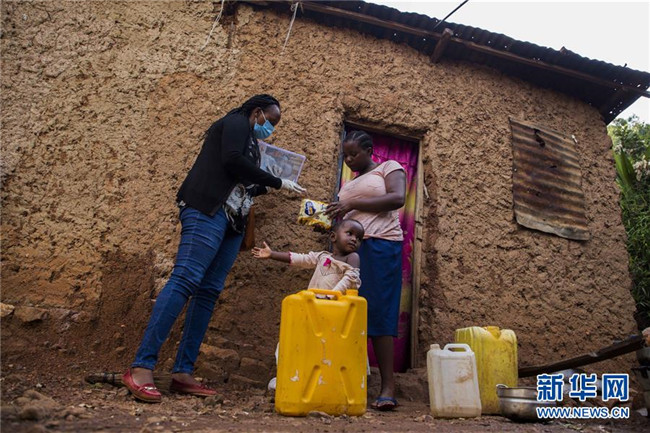 3月28日,在盧旺達(dá)首都基加利,一名政府官員(左)將救助物資交給受新冠肺炎管控措施影響的貧困家庭。 新華社發(fā)(西里爾·恩德格亞攝)