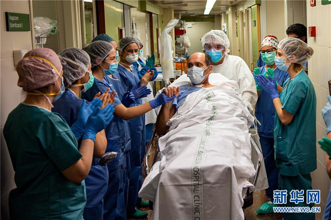 5月7日,在西班牙巴塞羅那的一家醫(yī)院,一名新冠患者在離開(kāi)重癥監(jiān)護(hù)室前和醫(yī)護(hù)人員握手致意。 新華社發(fā)(弗朗西斯科·阿維亞攝)