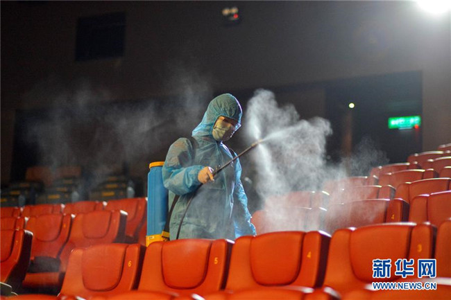 6月26日,馬來(lái)西亞吉隆坡一家電影院的工作人員為放映廳消毒。馬來(lái)西亞政府允許電影院等場(chǎng)所于7月1日起恢復(fù)營(yíng)業(yè)。新華社發(fā)(張紋綜攝)