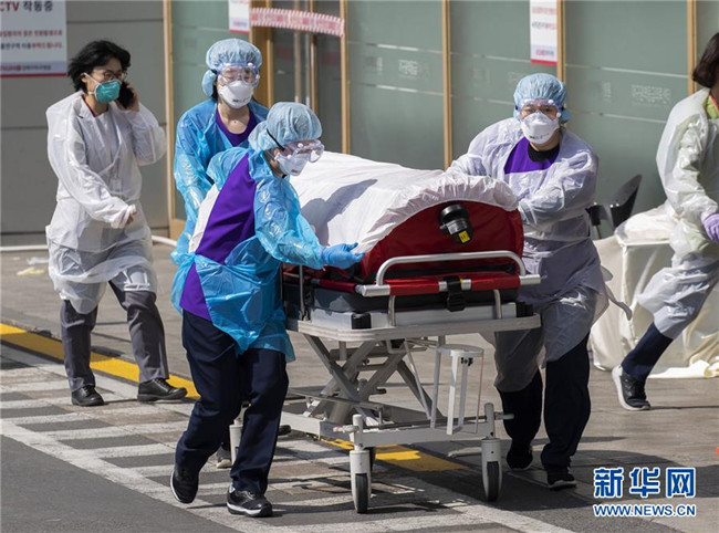 3月4日,在韓國(guó)大邱慶北大學(xué)醫(yī)院,醫(yī)護(hù)人員轉(zhuǎn)送患者。 新華社發(fā)(李相浩攝)