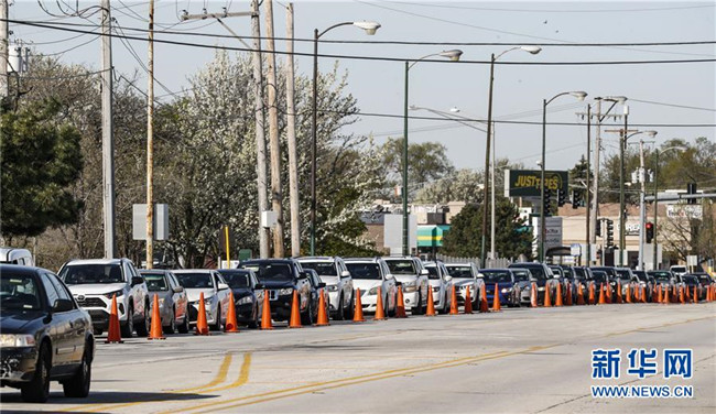 5月6日,在美國(guó)伊利諾伊州芝加哥西北部一處新冠病毒檢測(cè)點(diǎn),人們駕車(chē)排起長(zhǎng)隊(duì)等待檢測(cè)。 新華社發(fā)(喬爾·萊納攝)