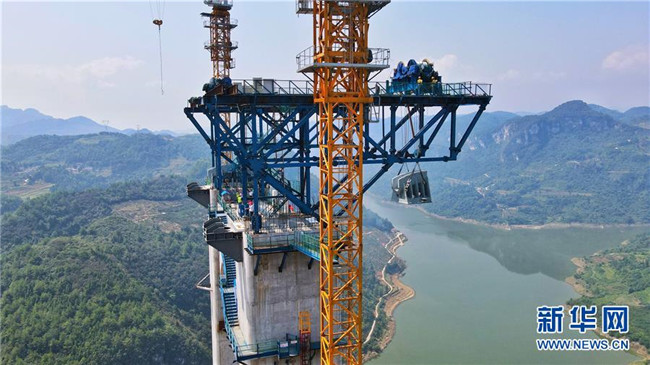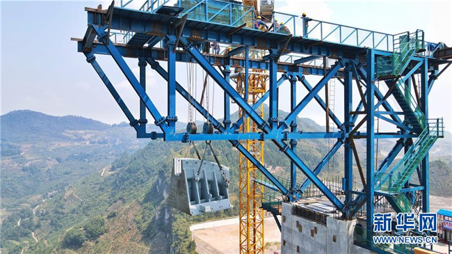 9月1日,工作人員在對主索鞍進行吊裝(無人機照片)。 新華社記者劉續(xù)攝