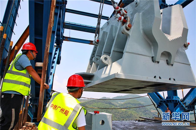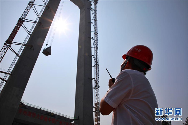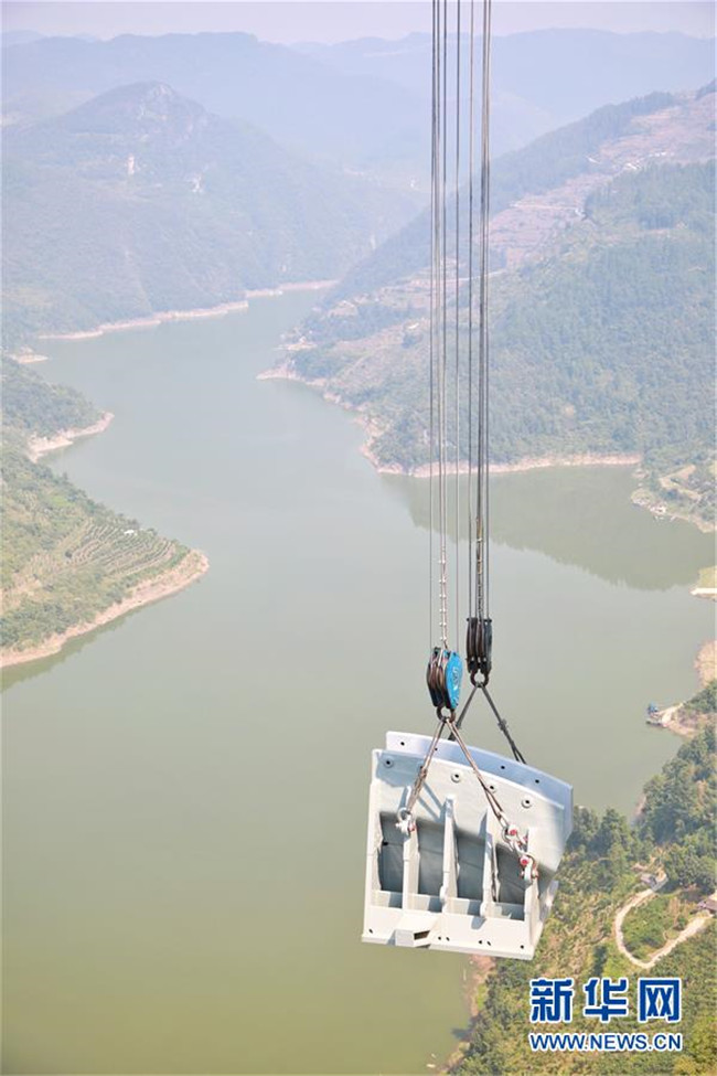 9月1日,工作人員在對主索鞍進行吊裝。新華社記者劉續(xù)攝