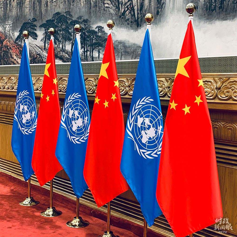 △視頻會(huì)見現(xiàn)場(chǎng)擺放的中國國旗和聯(lián)合國旗(總臺(tái)央視記者范一鳴拍攝)