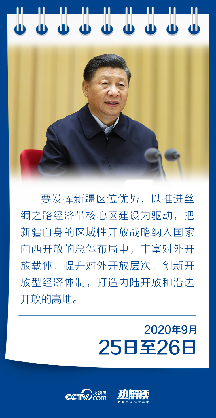 總書(shū)記說(shuō),要發(fā)揮新疆區(qū)位優(yōu)勢(shì),以推進(jìn)絲綢之路經(jīng)濟(jì)帶核心區(qū)建設(shè)為驅(qū)動(dòng),把新疆自身的區(qū)域性開(kāi)放戰(zhàn)略納入國(guó)家向西開(kāi)放的總體布局中,豐富對(duì)外開(kāi)放載體,提升對(duì)外開(kāi)放層次,創(chuàng)新開(kāi)放型經(jīng)濟(jì)體制,打造內(nèi)陸開(kāi)放和沿邊開(kāi)放的高地。