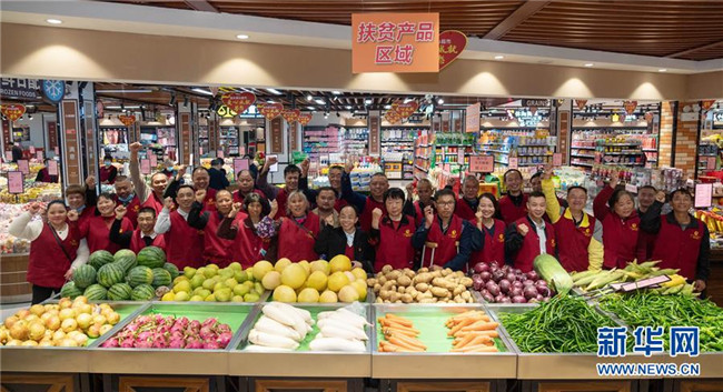 10月14日,在湖南省邵陽(yáng)市隆回縣都來(lái)連鎖超市,殘疾人羅龍桂(前排中)與殘疾員工們合影。羅龍桂修過(guò)多年鐘表電器,后來(lái)開(kāi)辦連鎖超市,成為一名企業(yè)家,他的企業(yè)先后幫助200余名殘疾人和120余戶貧困家庭脫貧。