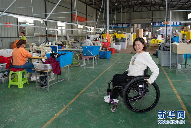 10月13日,在湖南省邵陽(yáng)市城步縣殘疾人楊淑亭開(kāi)辦的湖南七七科技股份有限公司生產(chǎn)車間里,工人們?cè)谥谱髅褡逄厣嘲?991年出生的苗族姑娘楊淑亭因車禍胸部以下高位截癱,通過(guò)不斷學(xué)習(xí)摸索,開(kāi)辦網(wǎng)店并注冊(cè)了自己的企業(yè),與周邊貧困家庭簽訂合作協(xié)議,制作售賣(mài)具有民族特色的背包和仿真花卉,帶動(dòng)上千名貧困人員及59名殘疾人就業(yè)。