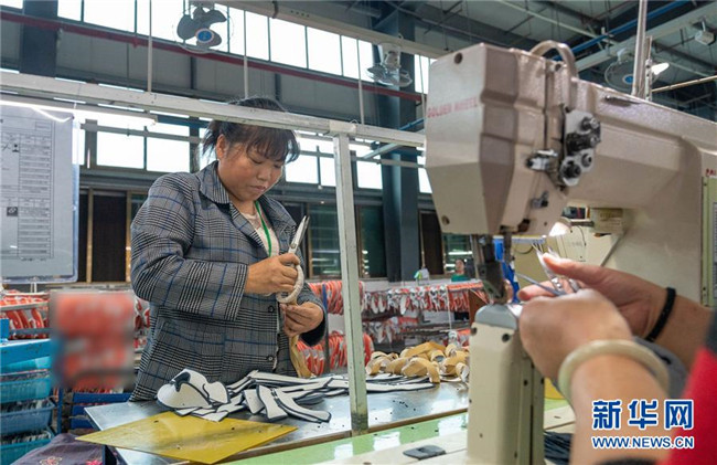 10月12日,在湖南省邵陽(yáng)市聯(lián)泰鞋業(yè)有限公司,裝有假肢的殘疾人麻玉美在生產(chǎn)線上工作。
