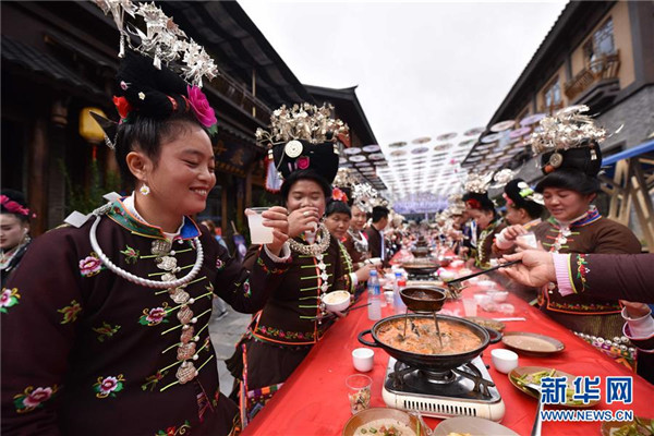 10月18日,苗族群眾在貴州省丹寨縣萬達小鎮(zhèn)吃新節(jié)長桌宴上品嘗佳肴。當日,貴州省黔東南苗族侗族自治州丹寨縣萬達小鎮(zhèn)舉辦苗族吃新節(jié)體驗活動。當地苗族同胞跳蘆笙舞、品長桌宴,并邀請游客參與其中,大家在歡聲笑語中樂享金秋。新華社發(fā)(凱尚宇攝)